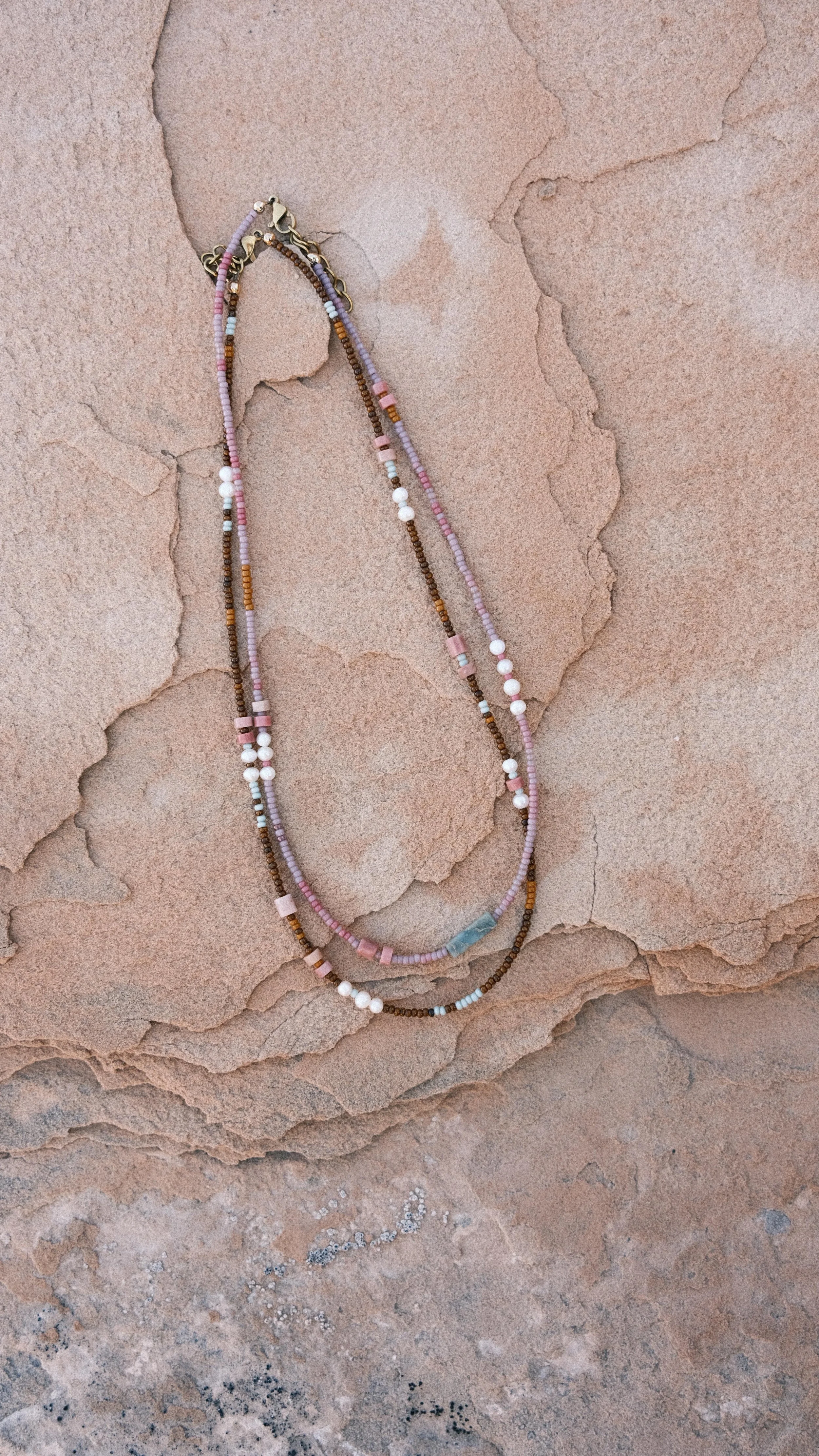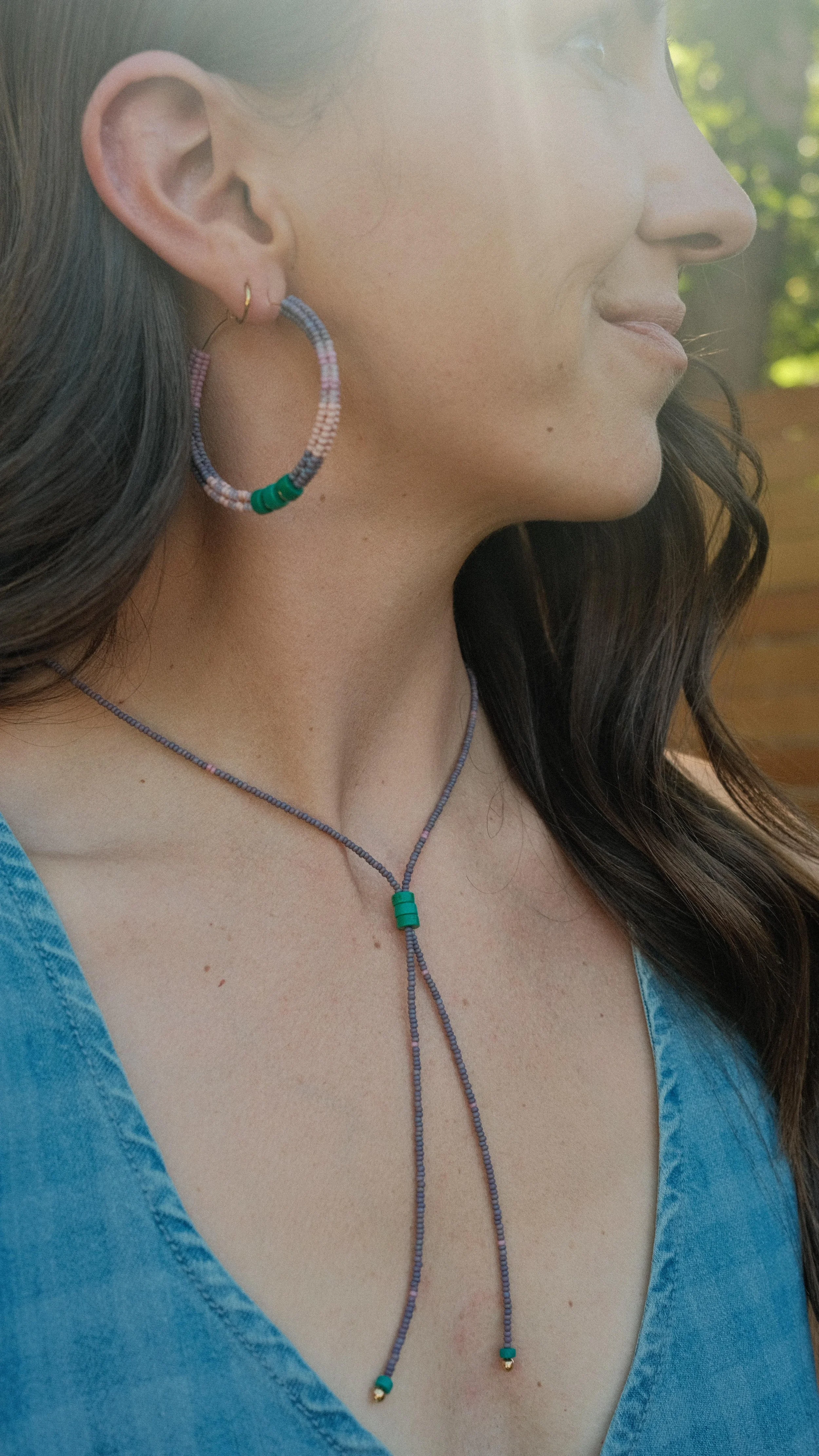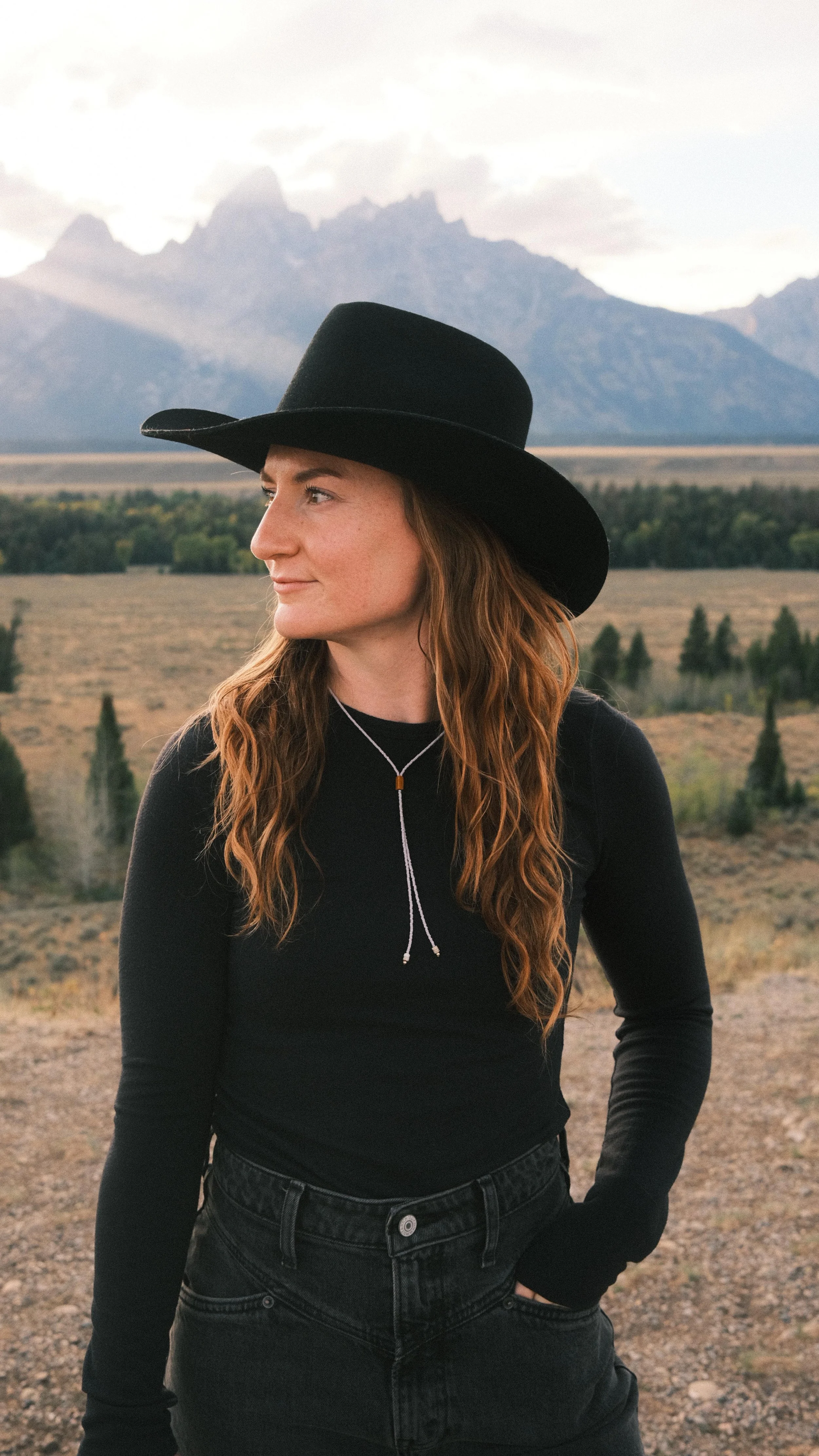Kayla in her beaded bolo + snowflake obsidian earrings 🩵